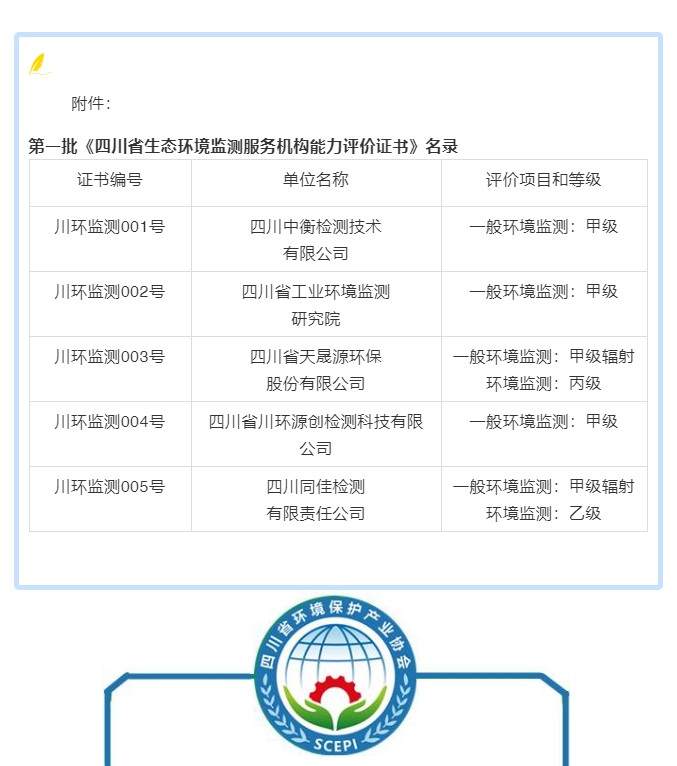 2月25日,四川省環境保護產業協會發布了首批《四川省生態環境監測服務機構能力評價證書》名錄。