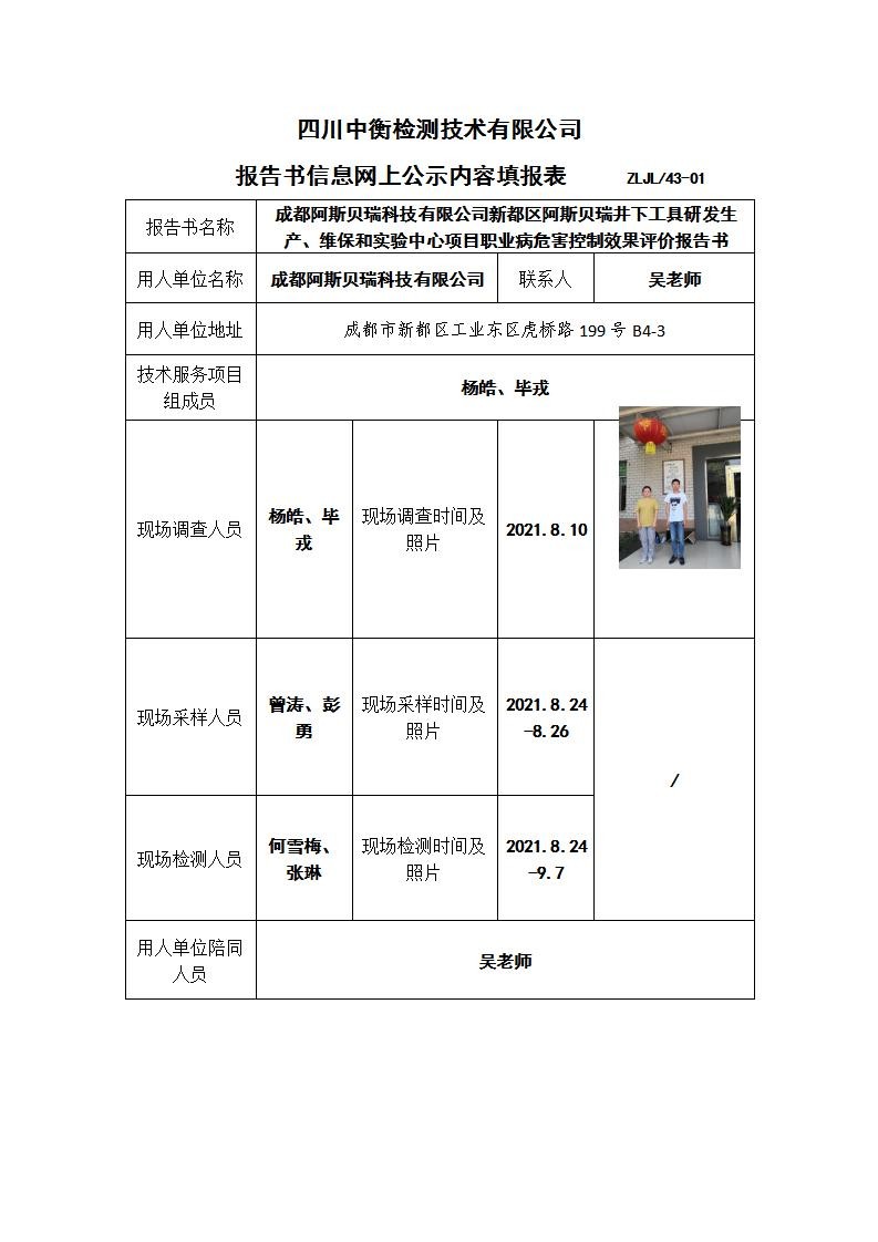 成都阿斯貝瑞科技有限公司新都區(qū)阿斯貝瑞井下工具研發(fā)生產(chǎn)、維保和實驗中心項目職業(yè)病危害控制效果評價報告書