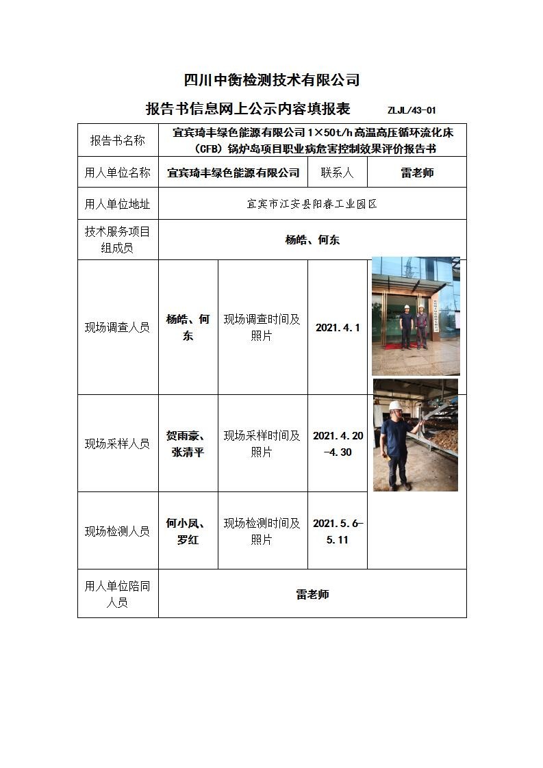 宜賓琦豐綠色能源有限公司1×50t/h高溫高壓循環(huán)流化床(CFB)鍋爐島項目職業(yè)病危害控制效果評價