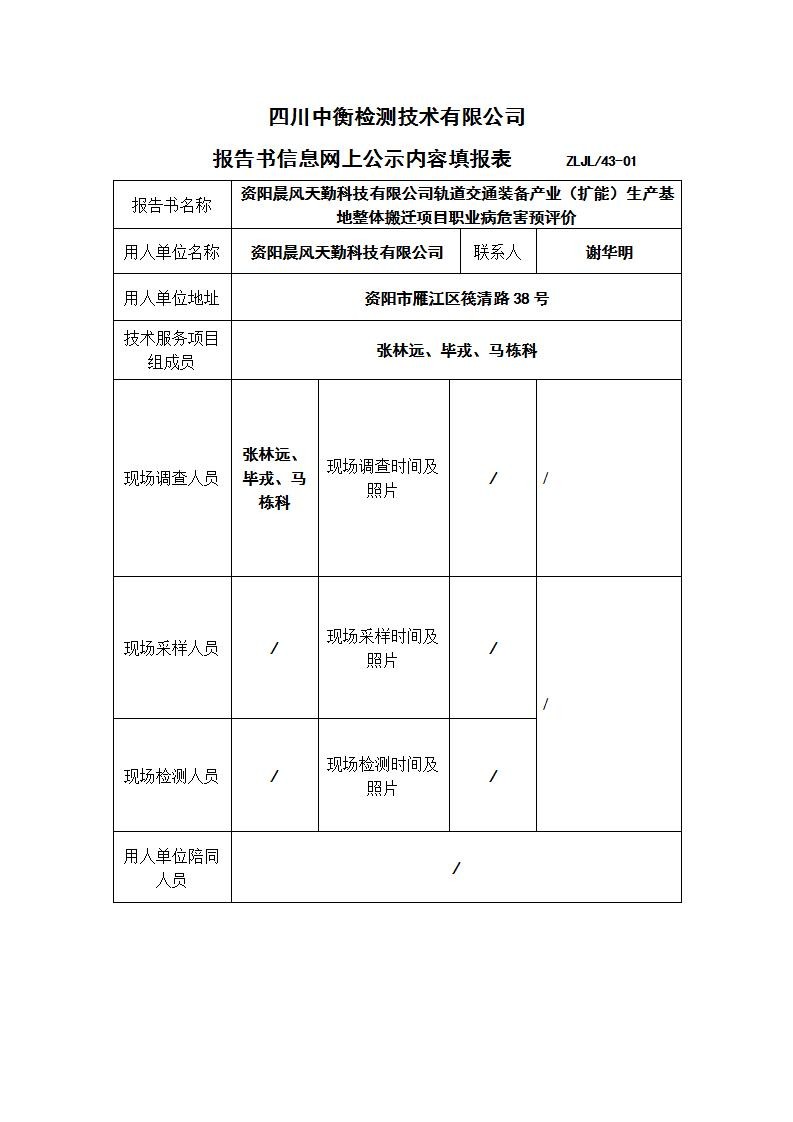 資陽晨風天勤科技有限公司軌道交通裝備產業(擴能)生產基地整體搬遷項目職業病危害預評價