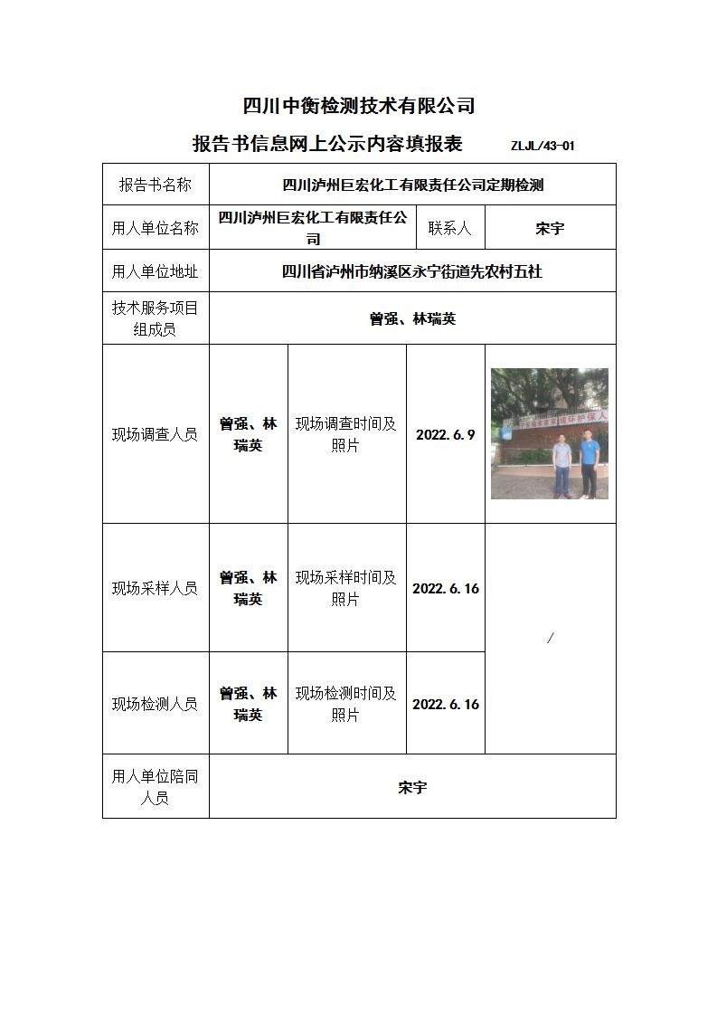 四川瀘州巨宏化工有限責(zé)任公司職業(yè)病危害定期檢測(cè)