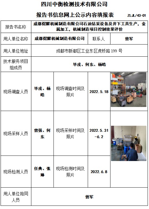 成都煜耀機械制造有限公司石油鉆采設備及井下工具生產,金屬加工,機械制造項目控制效果評價