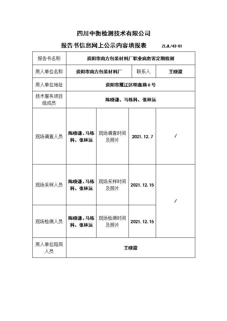 資陽市南方包裝材料廠職業(yè)病危害定期檢測