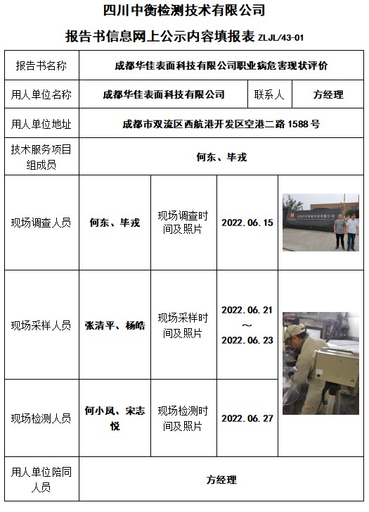 成都華佳表面科技有限公司職業(yè)病危害現(xiàn)狀評價