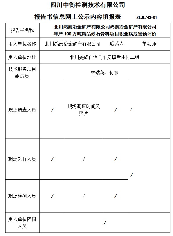 北川鴻泰冶金礦產有限公司鴻泰冶金礦產有限公司 年產100萬噸精品砂石骨料項目職業病危害預評價