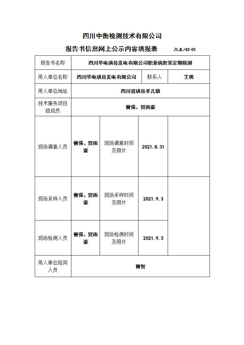 四川華電珙縣發電有限公司職業病危害定期檢測