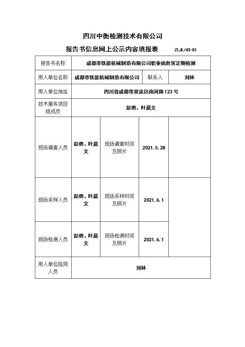 成都市鐵能機械制造有限公司職業病危害定期檢測