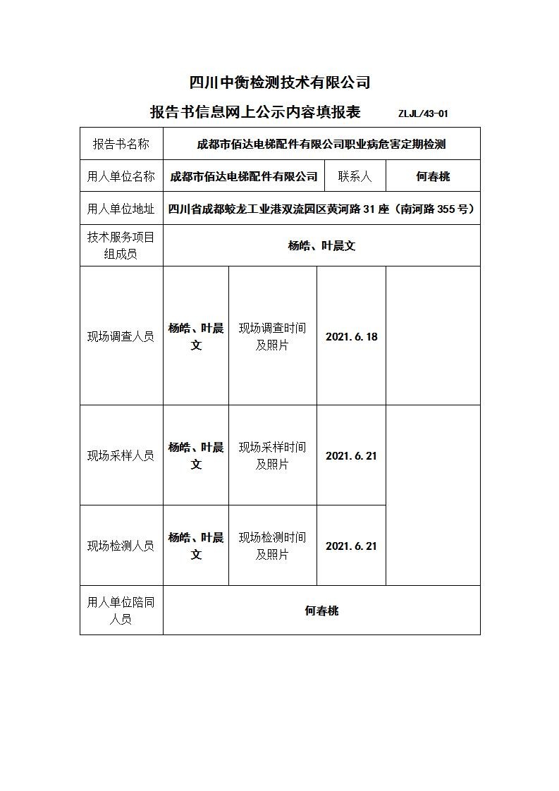 成都市佰達電梯配件有限公司職業病危害定期檢測