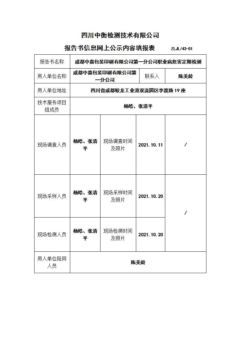 成都中嘉包裝印刷有限公司第一分公司職業病危害定期檢測