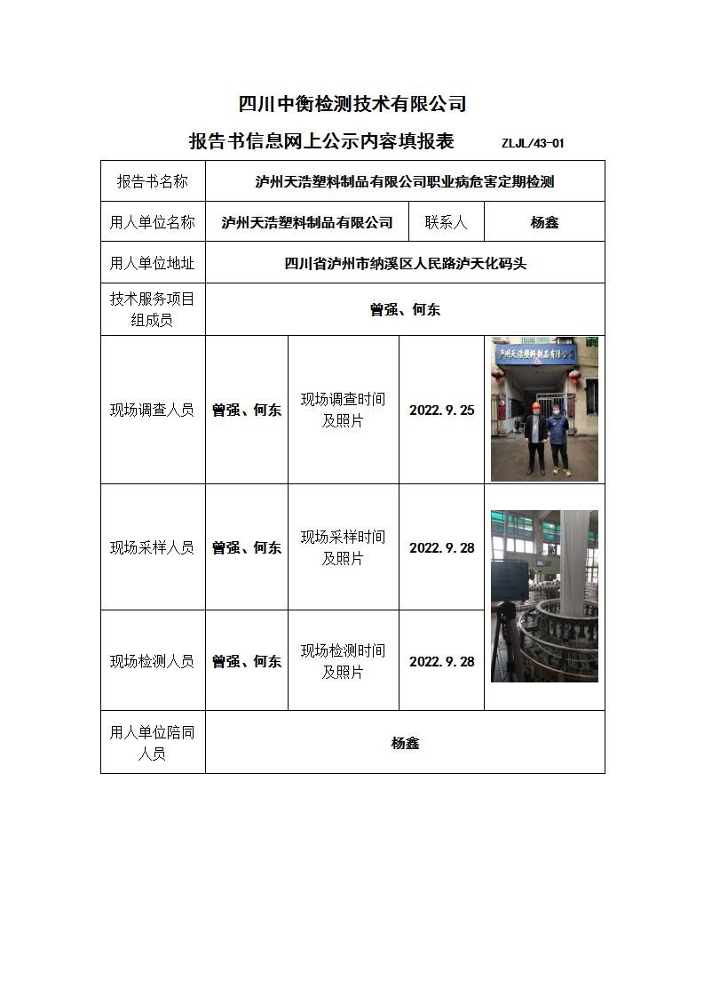瀘州天浩塑料制品有限公司職業病危害定期檢測