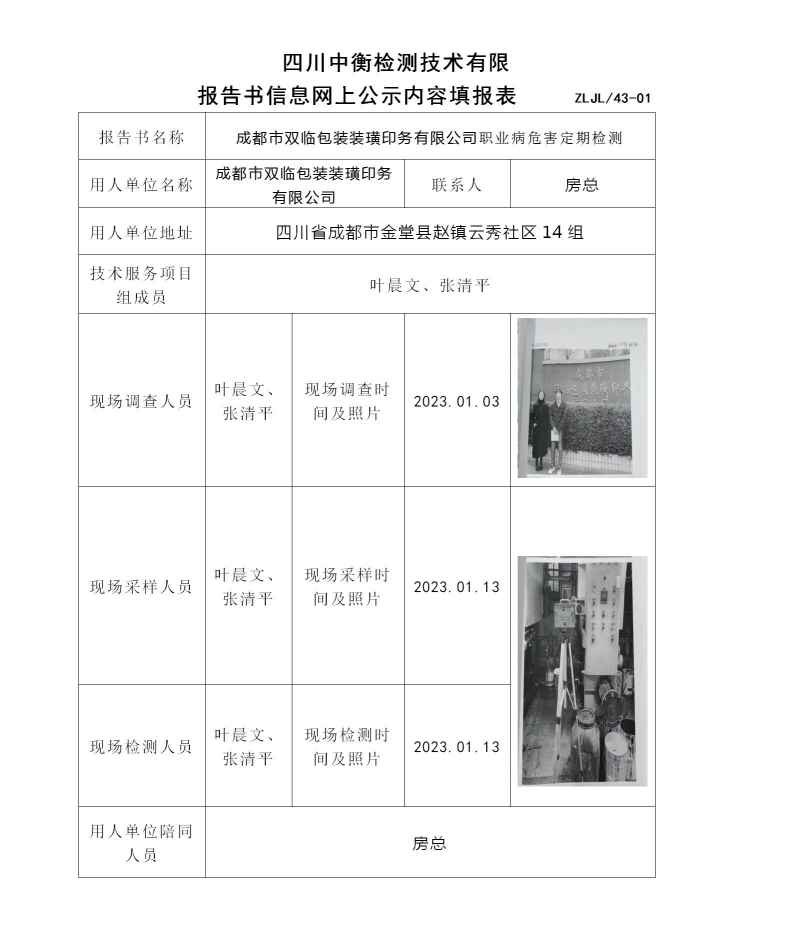 成都市雙臨包裝裝璜印務有限公司職業病危害定期檢測