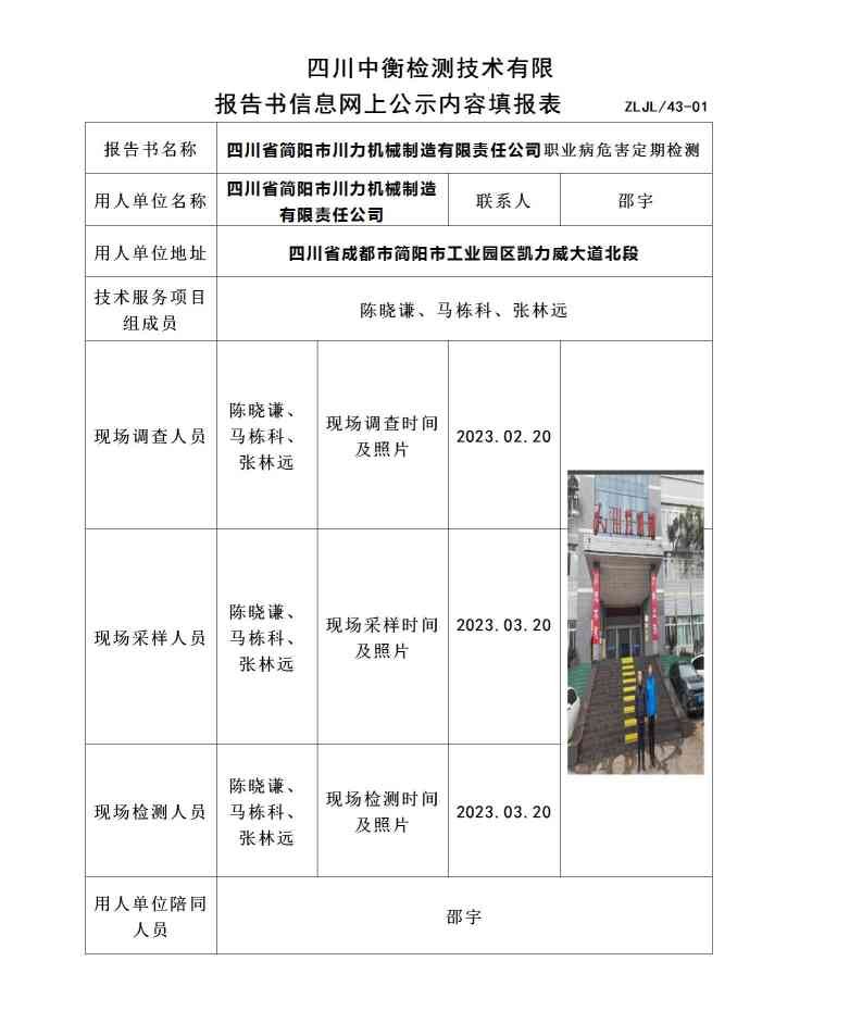 四川省簡陽市川力機械制造有限責任公司職業病危害定期檢測