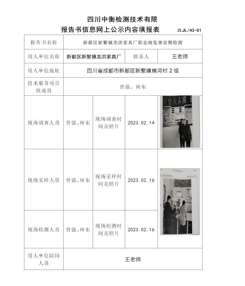 新都區新繁鎮龍洪家具廠職業病危害定期檢測