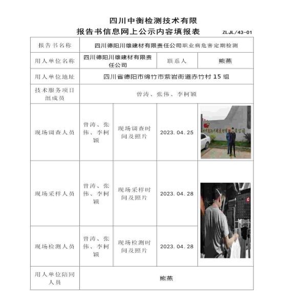 四川德陽川雄建材有限責任公司職業(yè)病危害定期檢測