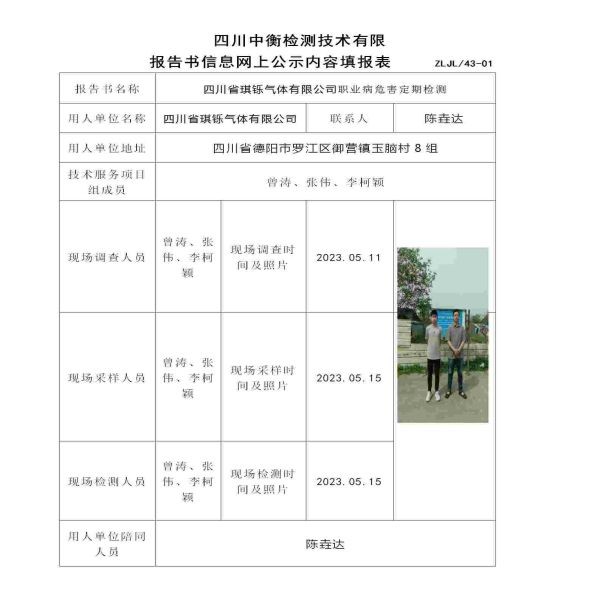 四川省琪鑠氣體有限公司職業病危害定期檢測