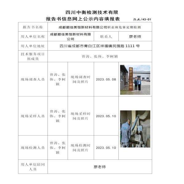 成都順佳美恒新材料有限公司職業病危害定期檢測