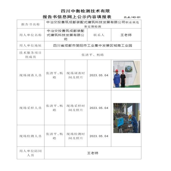中冶交投善筑成都裝配式建筑科技發展有限公司職業病危害定期檢測
