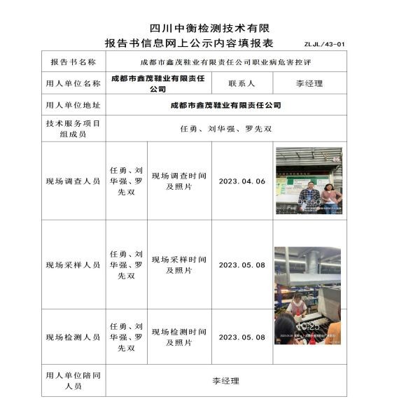 成都市鑫茂鞋業有限責任公司職業病危害定期檢測