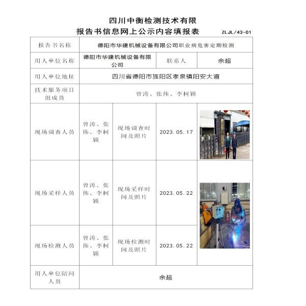 德陽市華建機械設備有限公司職業病危害定期檢測