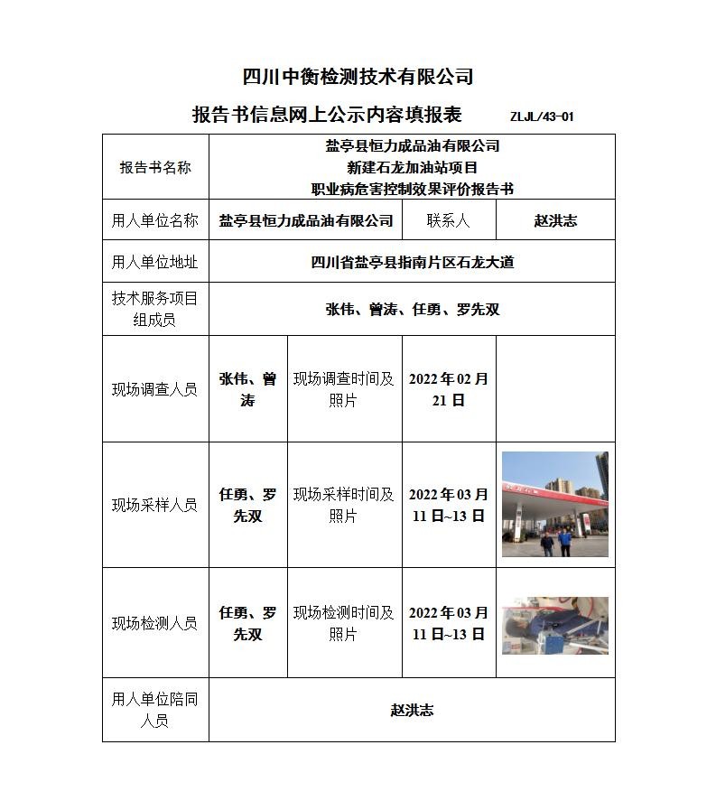 鹽亭縣恒力成品油有限公司新建石龍加油站項目職業病危害控制效果評價