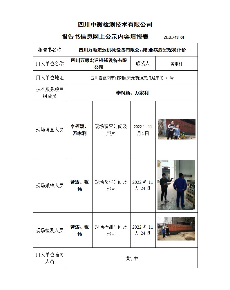 四川萬順宏運機械設備有限公司 職業病危害現狀評價報告書