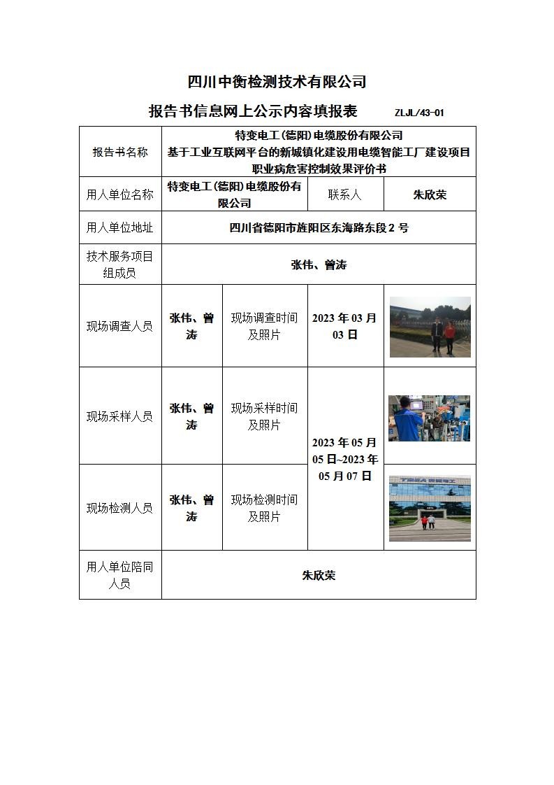 特變電工(德陽(yáng))電纜股份有限公司“基于工業(yè)互聯(lián)網(wǎng)平臺(tái)的新城鎮(zhèn)化建設(shè)用電纜智能工廠建設(shè)項(xiàng)目”職業(yè)病危害控制效果評(píng)價(jià)