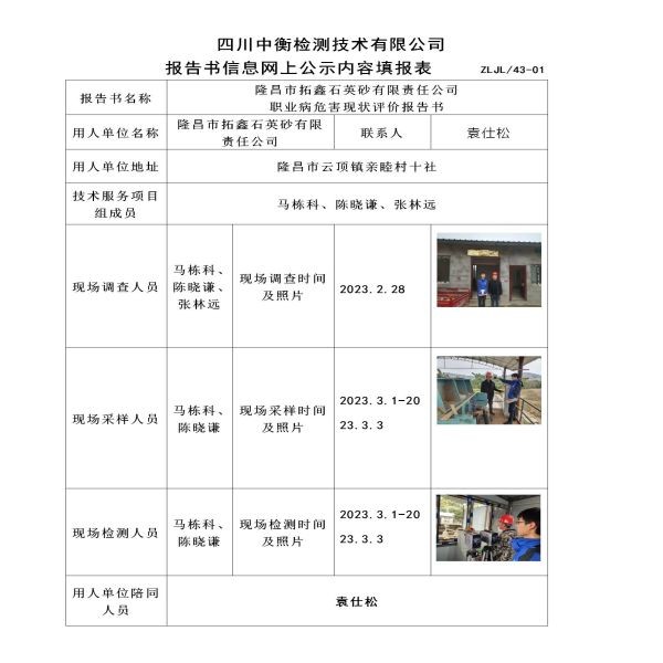 隆昌市拓鑫石英砂有限責任公司職業病危害現狀評價