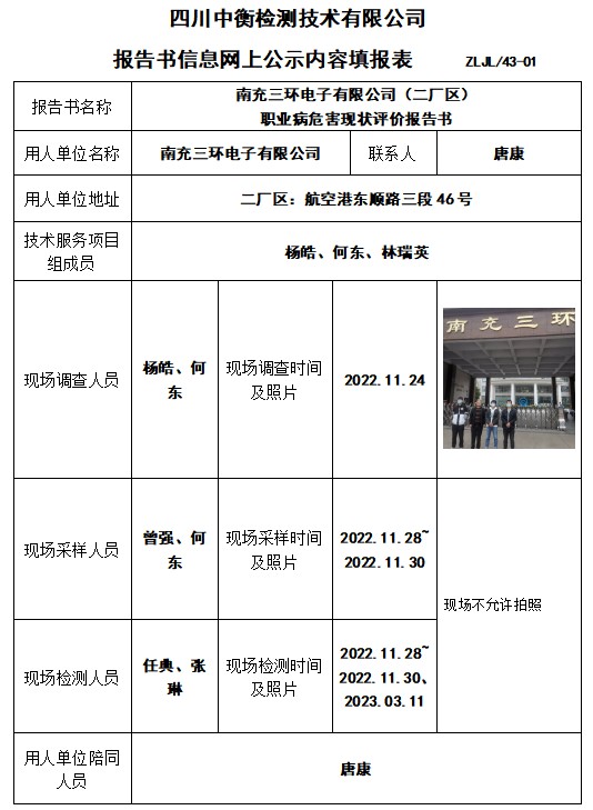 南充三環電子有限公司(二廠區) 職業病危害現狀評價報告書