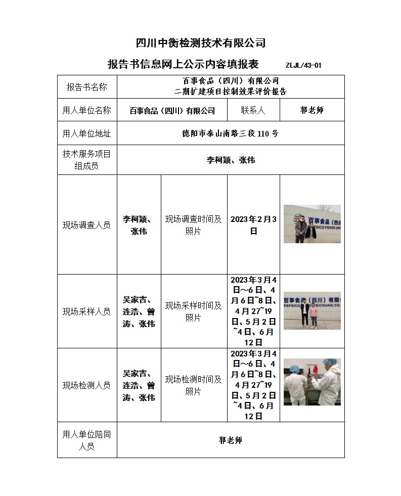 百事食品(四川)有限公司 二期擴建項目 職業病危害控制效果評價