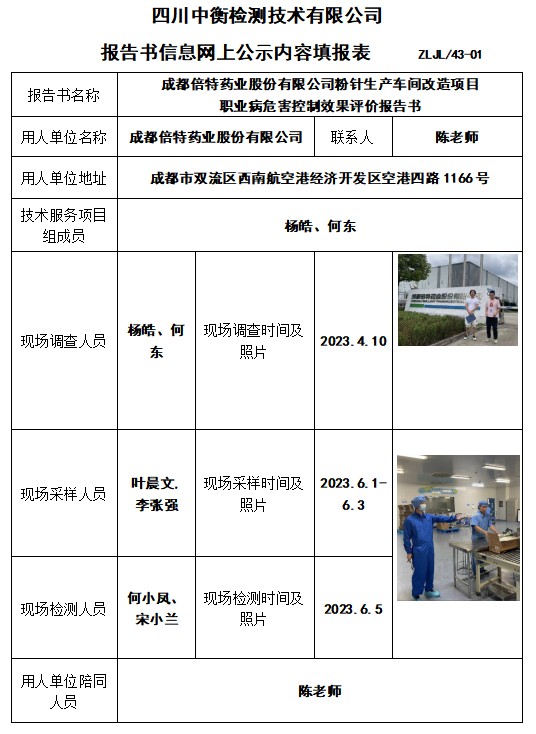 成都倍特藥業股份有限公司粉針生產車間改造項目 職業病危害控制效果評價報告書