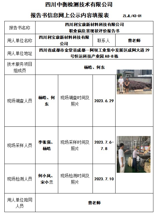四川利寶康新材料科技有限公司 職業病危害現狀評價報告書