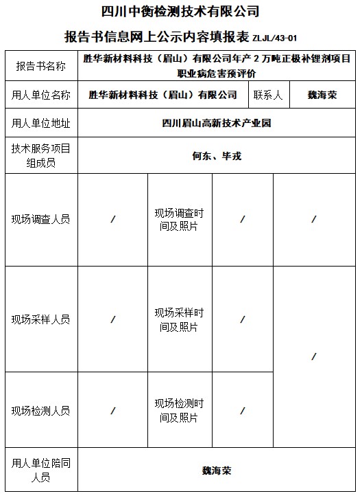 勝華新材料科技(眉山)有限公司年產2萬噸正極補鋰劑項目職業病危害預評價