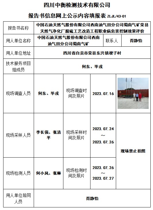 中國石油天然氣股份有限公司西南油氣田分公司蜀南氣礦榮縣天然氣凈化廠脫硫工藝改造工程職業病危害控制效果評價