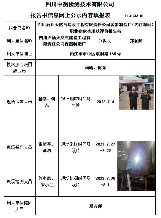四川石油天然氣建設工程有限責任公司容器制造廠(內江車間)職業病危害現狀評價報告書