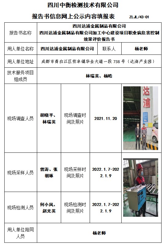 四川達浦金屬制品有限公司 四川達浦金屬制品有限公司加工中心建設項目職業病危害控制效果評價報告書