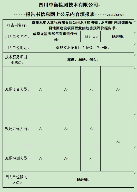 成都龍星天然氣有限責任公司龍91D井組、龍93HF井組鉆采項目地面建設項目職業病危害預評價報告書